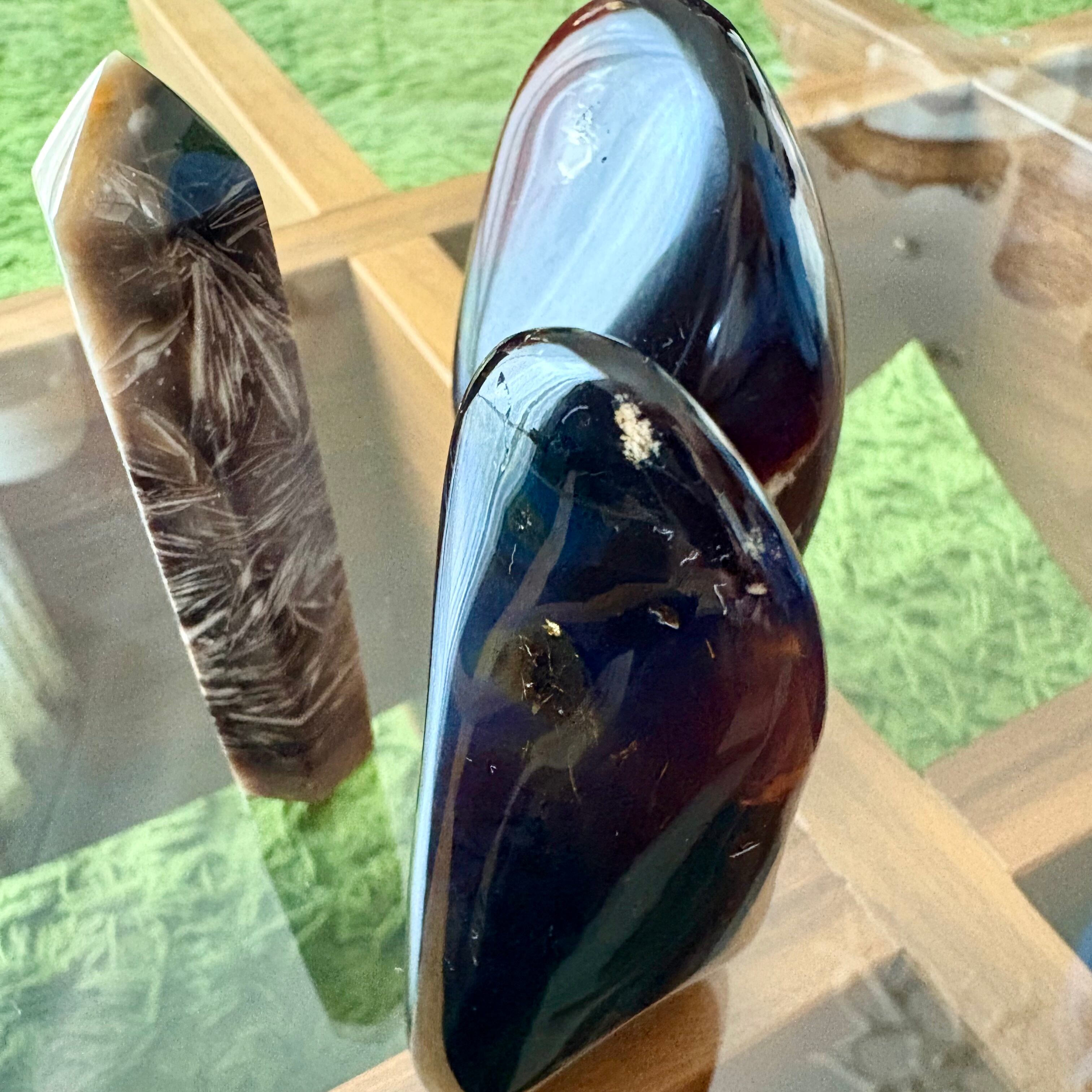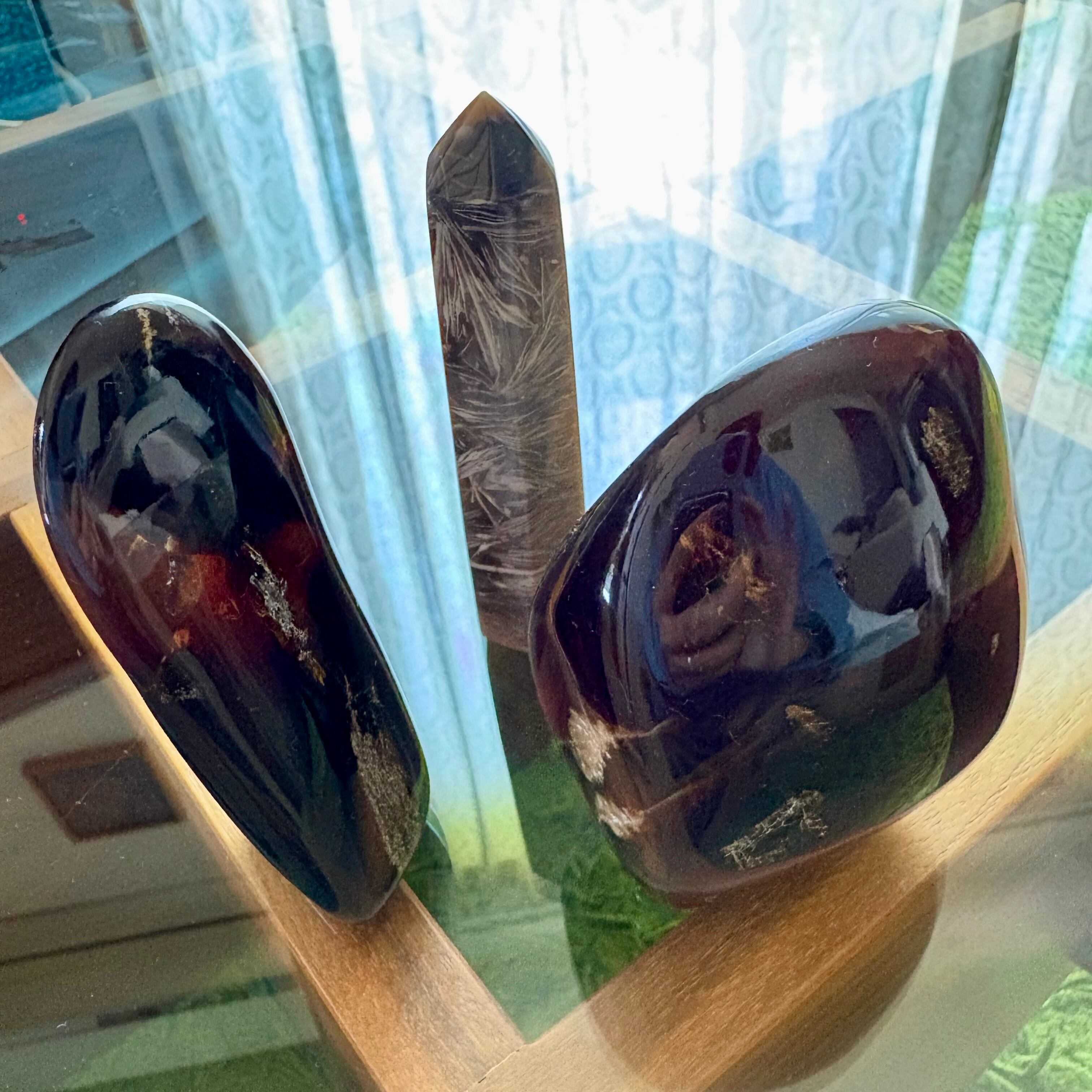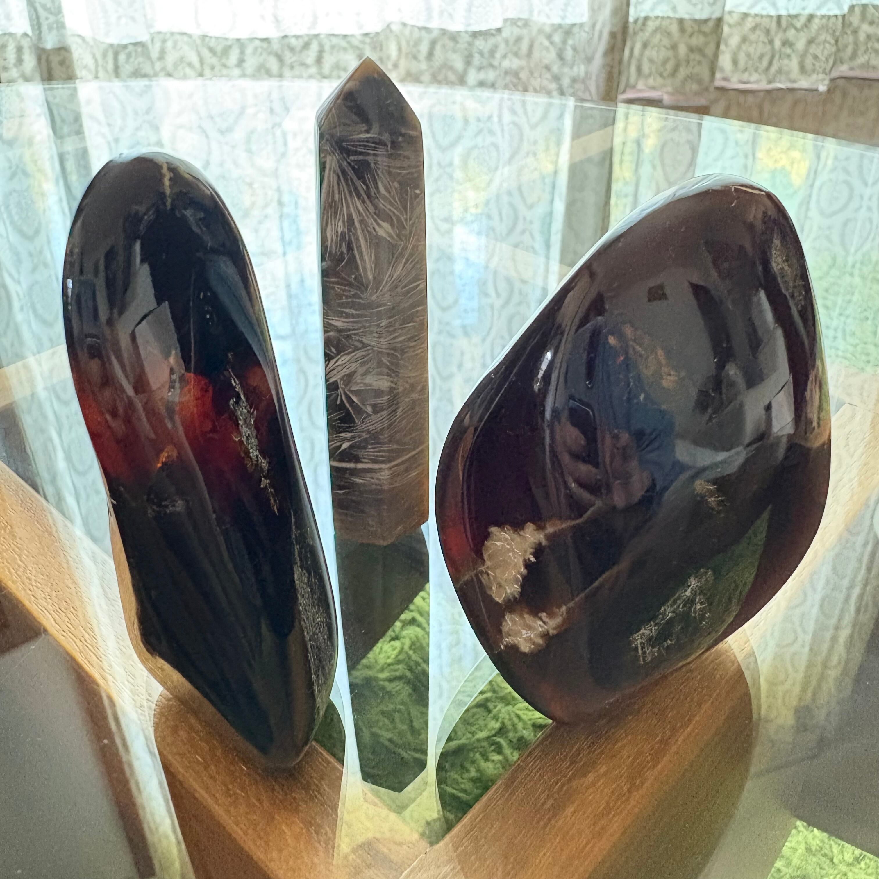 アンバーフリーフォームとフェザーアゲートのサイズは高さ約10㎝、それぞれ若干の個体差があります。どちらも自然素材を使用しており、唯一無二の魅力を持っています。お部屋のアクセントとして、また贈り物としても非常に喜ばれるアイテムです。
