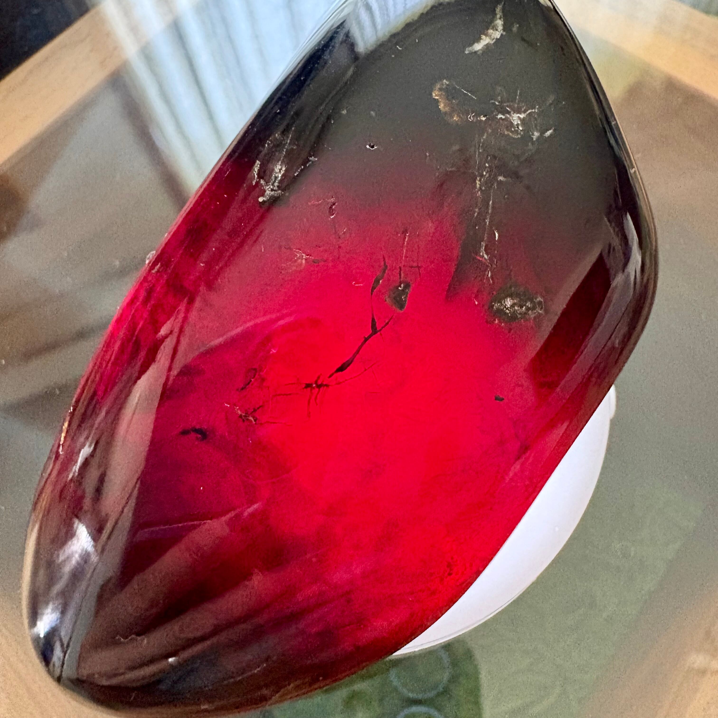 太陽光や強い照明で照らすと赤く光を通し、UVライトでは青く光ります。その美しさをお楽しみください。